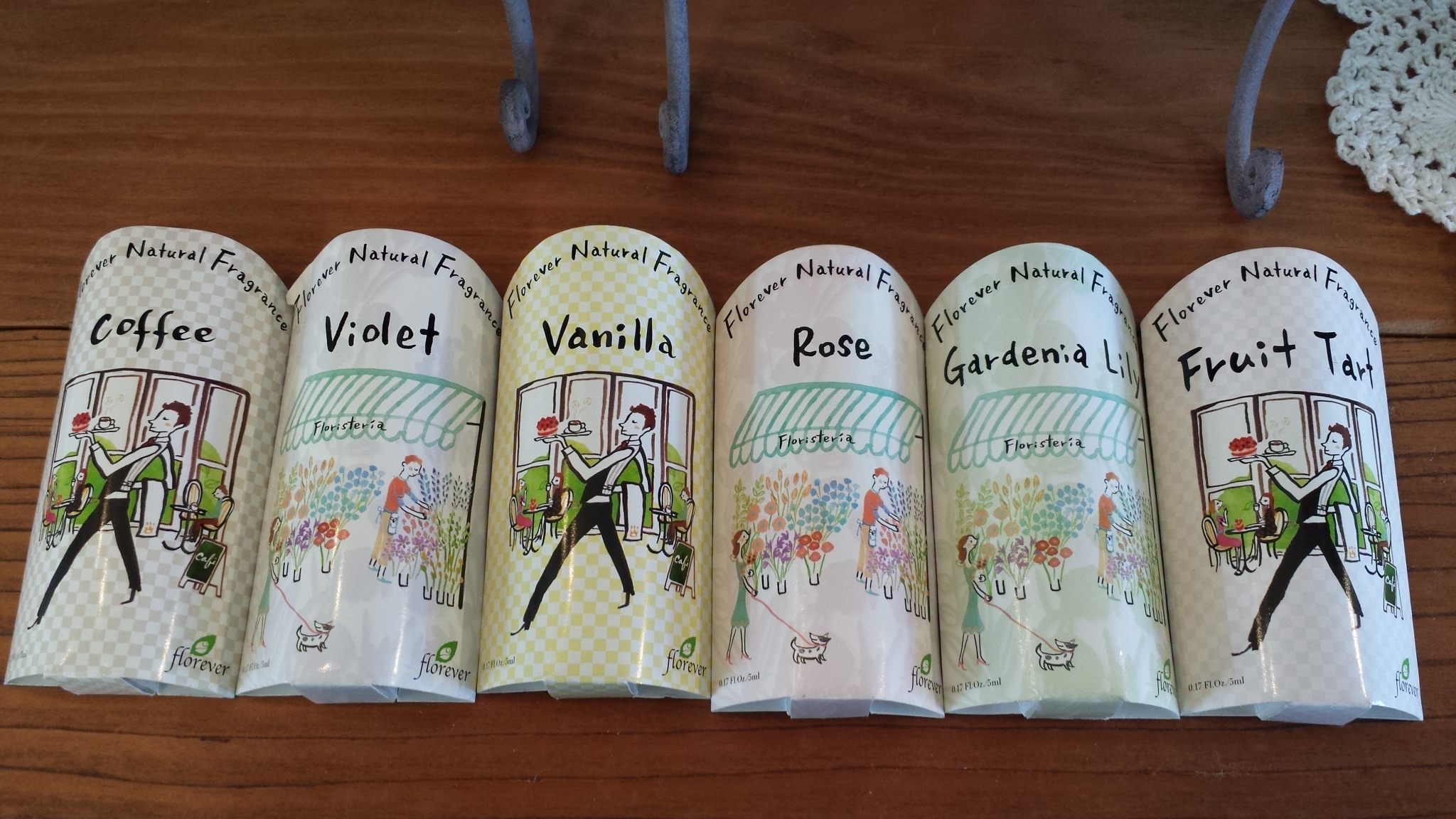 左からコーヒー、バイオレット、バニラ、ローズ、ガーデニアリリー、フルーツタルトの香りです♫