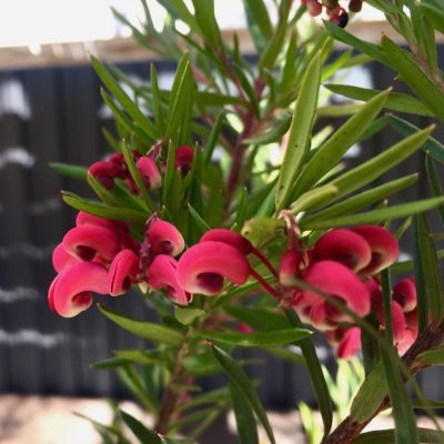 細長い葉に、濃いピンク色の花を咲かせる グレビレア・ジョンエバンス。
