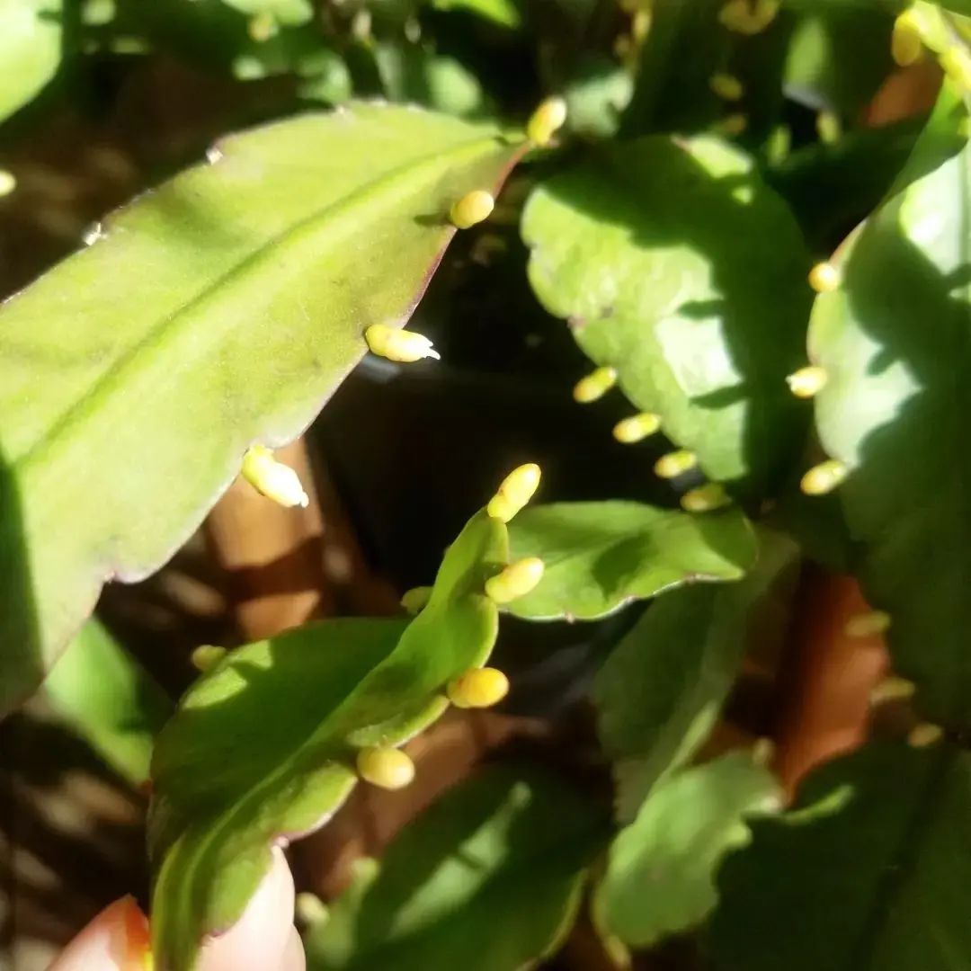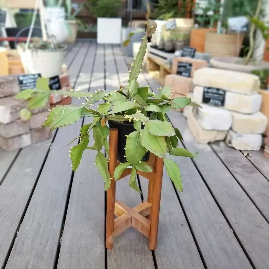 サボテンの一種ですがトゲは無く、多肉植物のような見た目をしていて、葉先に花を咲かせます。